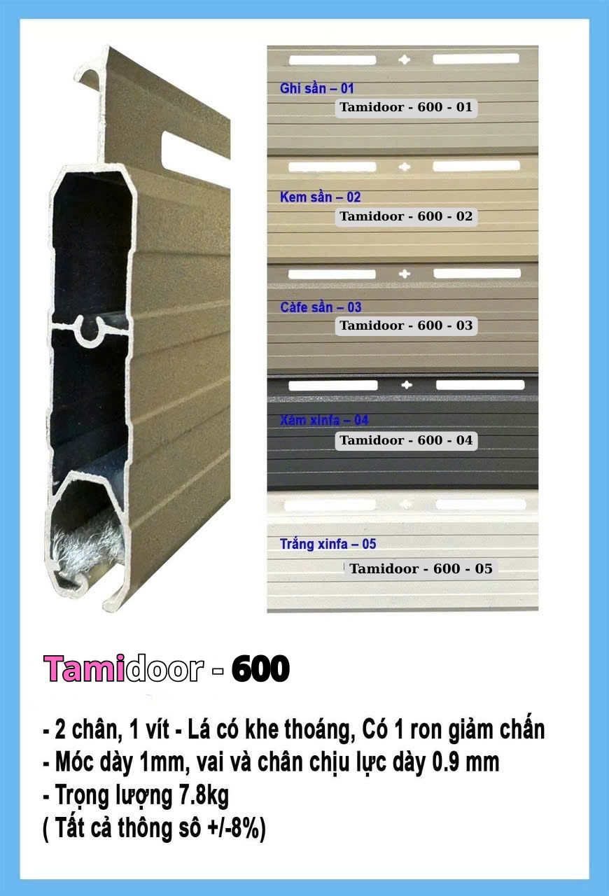 Cửa cuốn Đức Tamidoor 600 được thiết kế với nhiều gam màu : ghi sần, kem sần, cà phê sần, xám xinfa và trắng xinfa. Thân cửa có 2 chân, 1 vít, lá được thiết kế khe thoáng giúp lưu thông không khí, đồng thời trang bị 1 ron giảm chấn giúp giảm tiếng ồn trong quá trình vận hành.